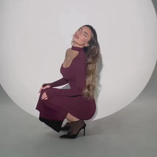 Robe noire élégante au design minimaliste et sophistiqué. Coupe ajustée avec décolleté épaules dénudées et ras-de-cou qui met en valeur les épaules et le décolleté. Silhouette midi épurée, manches longues et confort optimal. Parfaite pour les soirées, les événements ou une allure sophistiquée.