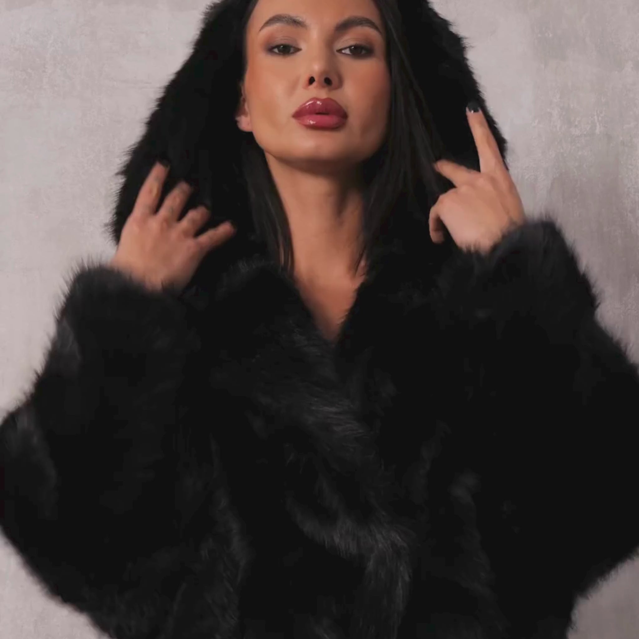 Un manteau court en fourrure noire au style glamour et contemporain. Doux, avec une capuche douillette, des manches longues et une coupe légèrement cintrée. Chaud et agréable au toucher, il est idéal pour compléter des tenues élégantes ou apporter une touche de caractère à vos looks de soirée et d'occasion spéciale. Parfait pour un hiver chic.