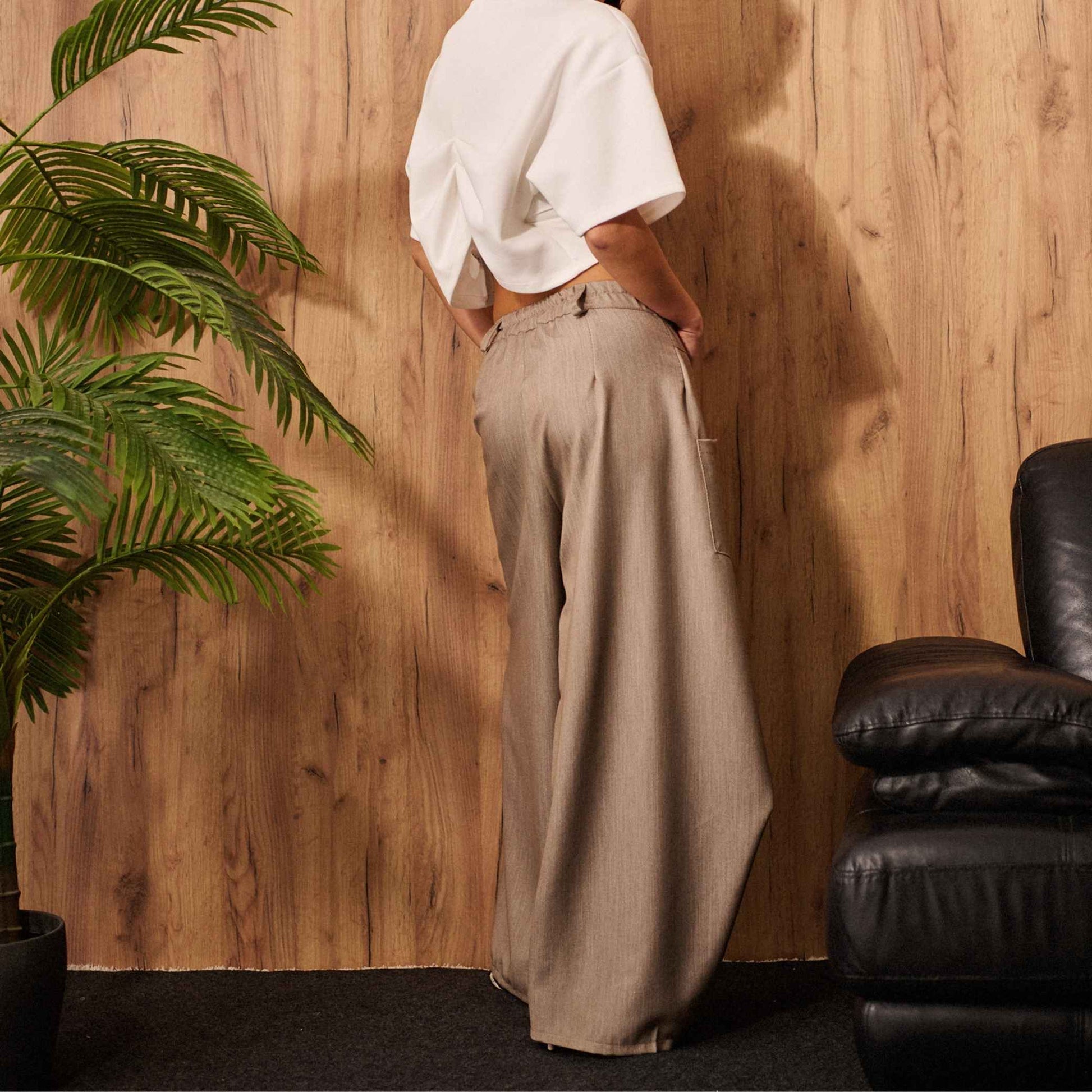 Pantalone dal design sartoriale e contemporaneo. Modello a vita alta con particolare costruzione incrociata sul davanti che crea movimento e un effetto drappeggiato. Gamba ampia e linea fluida, realizzata in tessuto leggero e strutturato. Ideale per look eleganti e moderni, perfetto da abbinare a top minimal o blazer.