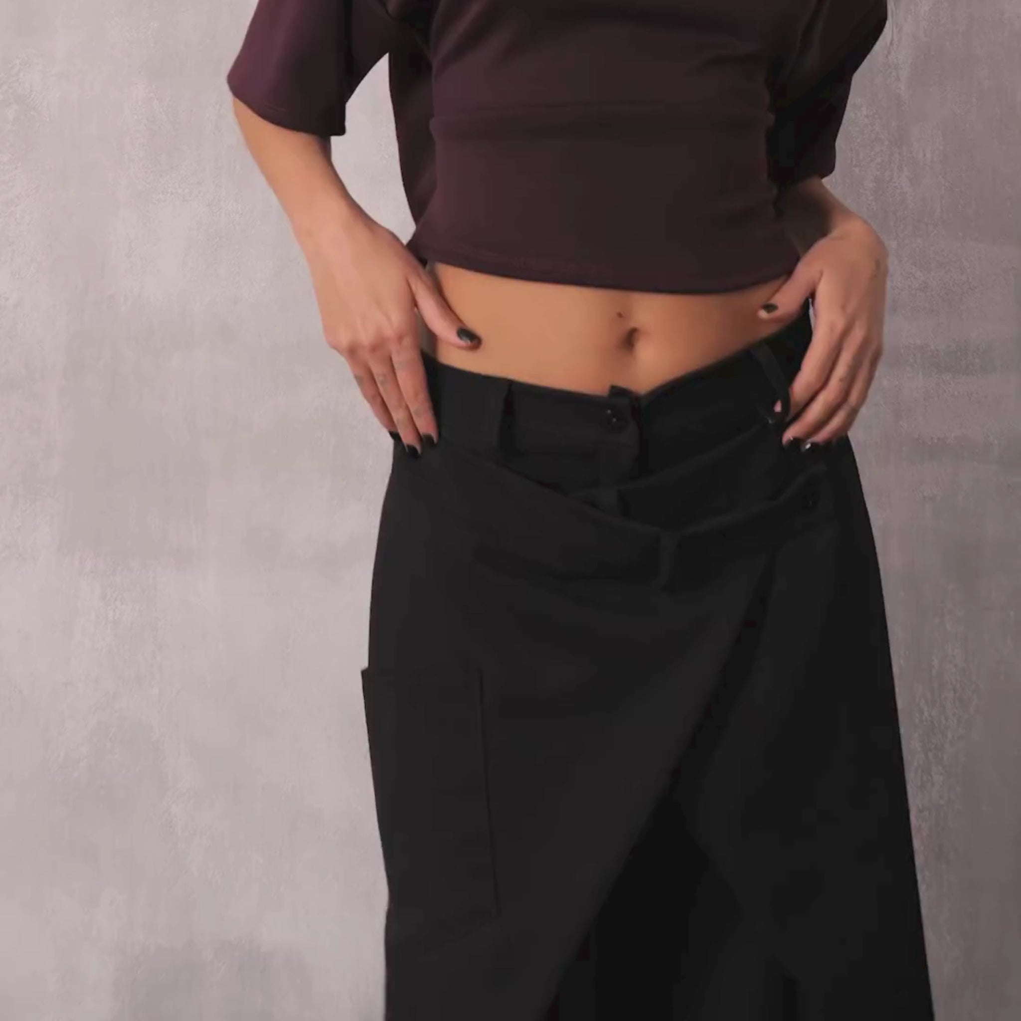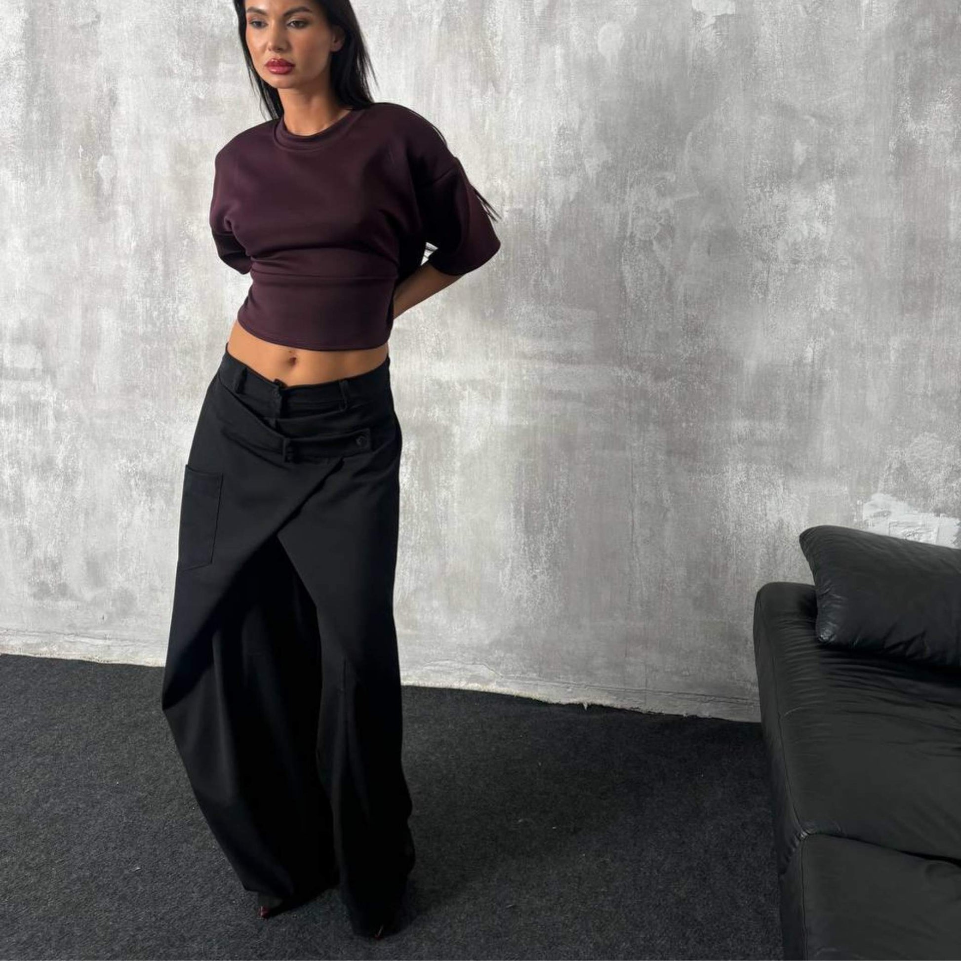 Pantalone dal design sartoriale e contemporaneo. Modello a vita alta con particolare costruzione incrociata sul davanti che crea movimento e un effetto drappeggiato. Gamba ampia e linea fluida, realizzato in tessuto leggero e strutturato. Ideale per look eleganti e moderni, perfetto da abbinare a top minimal o blazer.